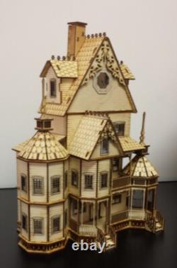 Here is the Ashley in 1:48 scale it has detailed skits, porch, functioning doors, engraved siding and shingles. Measures house 11W X 6.5D X 14.5H rooms have 2.5" ceiling height with rooms averaging 2.5x2.5" and the large side rooms are 2.5x5 This house is a great design with a lot of room to decorate. A great addition to any collection.